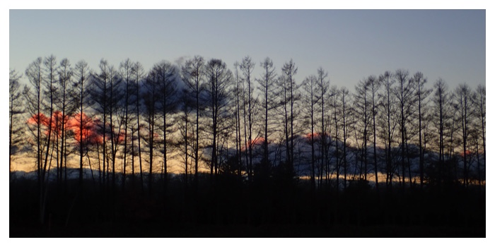 Evening glow through larch trees (January 14). カラマツ林越しの夕焼け。