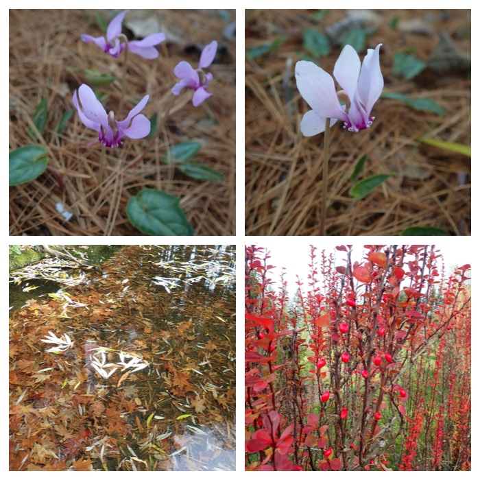 The way to the Manabe garden. Ripe red seeds of Japanese spindle tree, swamp ash trees along Kikanko river (two photos) and three trees (maple, elm, and swamp ash) near the athletic ground of Obihiro Kita high school.