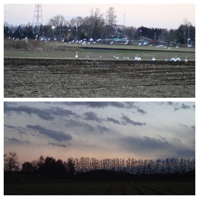飛び立った白鳥を見送るキツネ(上の写真)とカラマツ並木の夕暮れ(下の写真)。