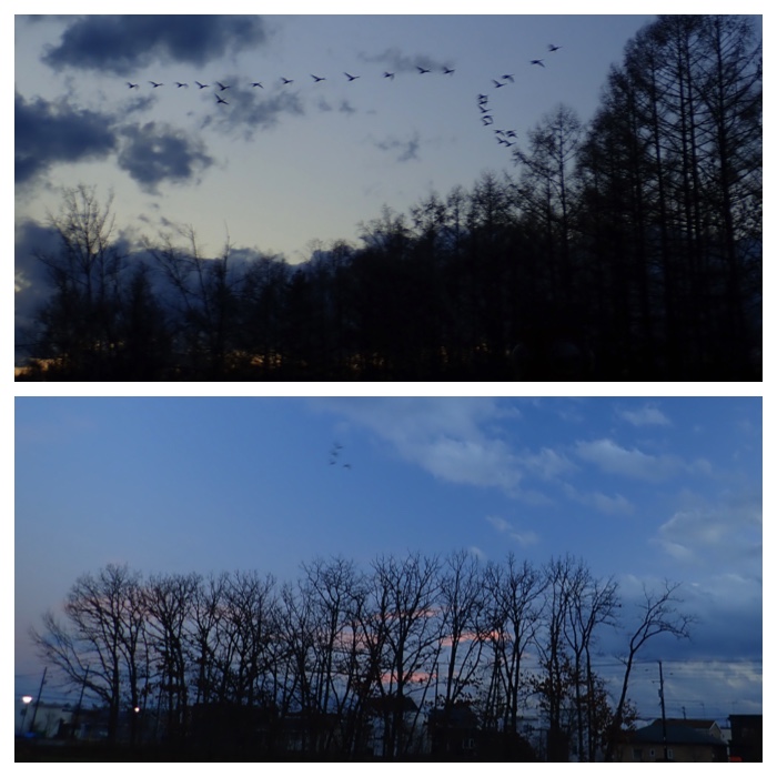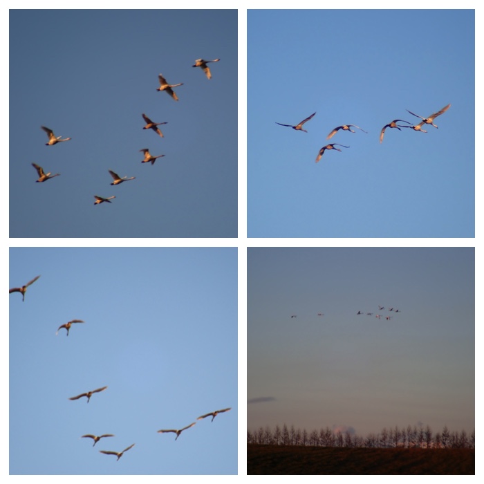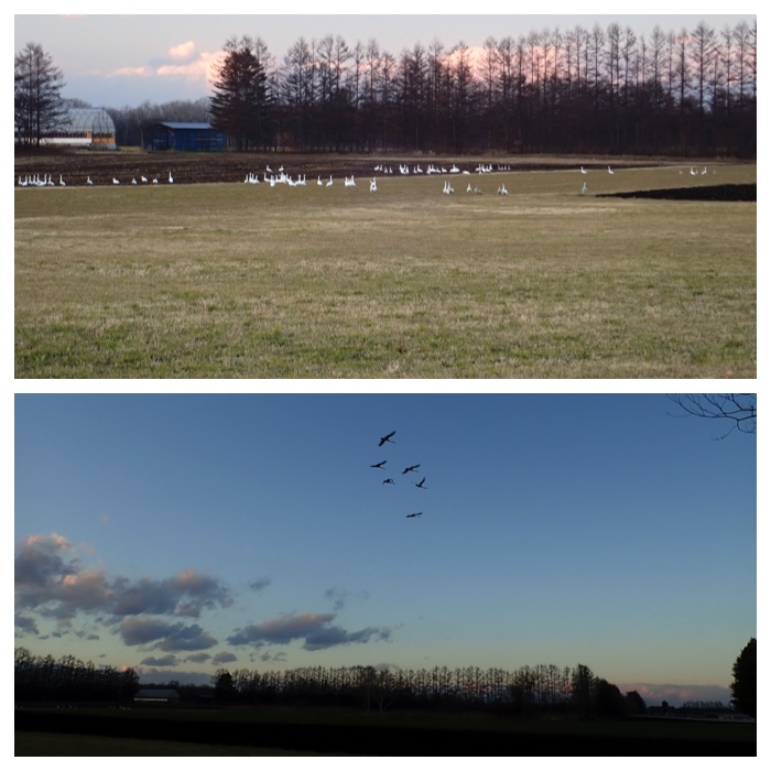 Swans flying over the pasture field of Obihiro Agricultural High School (on November 30).