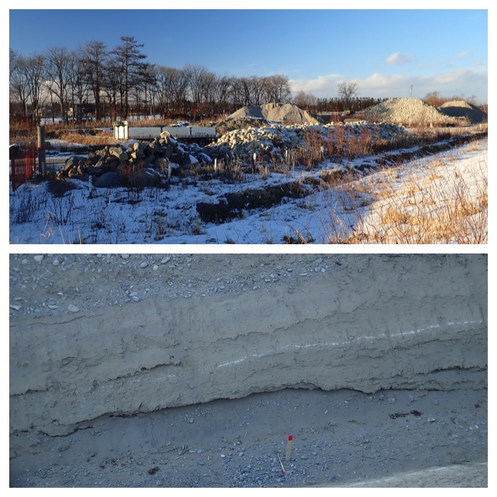 Stone and gravel excavation site and the volcanic ash layer appeared on the newly cut drain ditch (January 9). 堤防脇に側溝が掘られていました。薄い白い層があり、火山灰ではないかと思いました。
