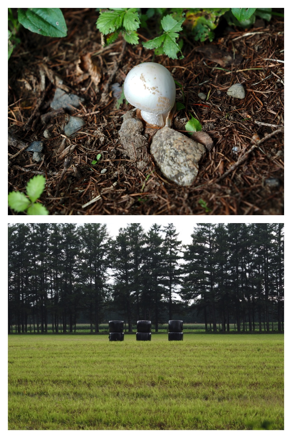道端のキノコ(上)、農業高校圃場のラップサイレージ(下)