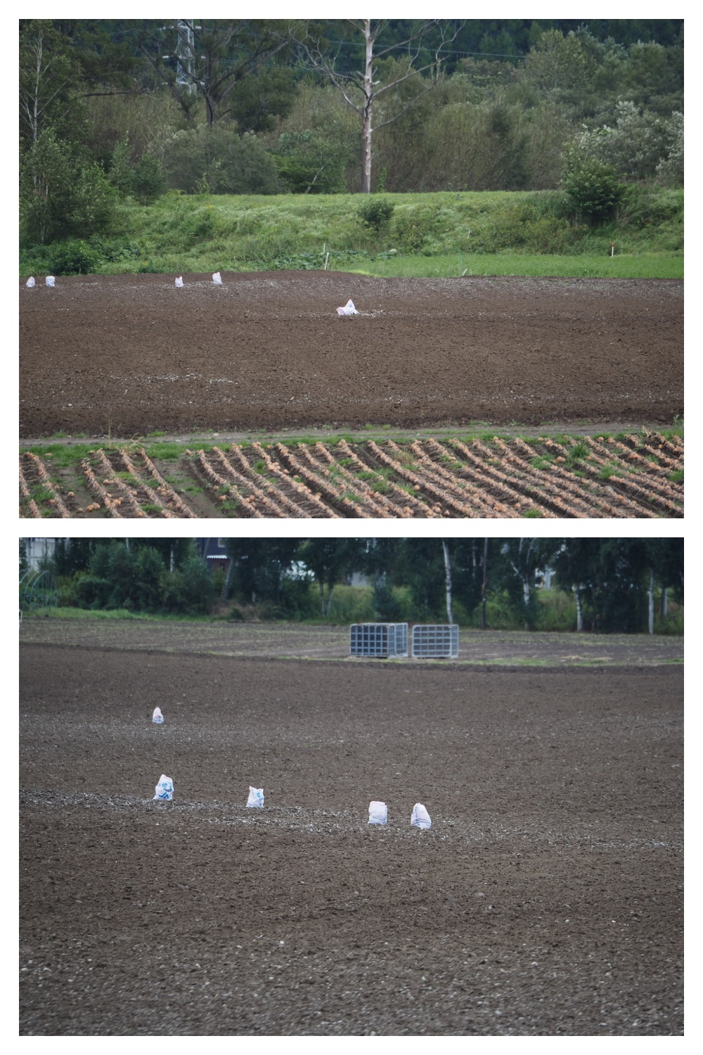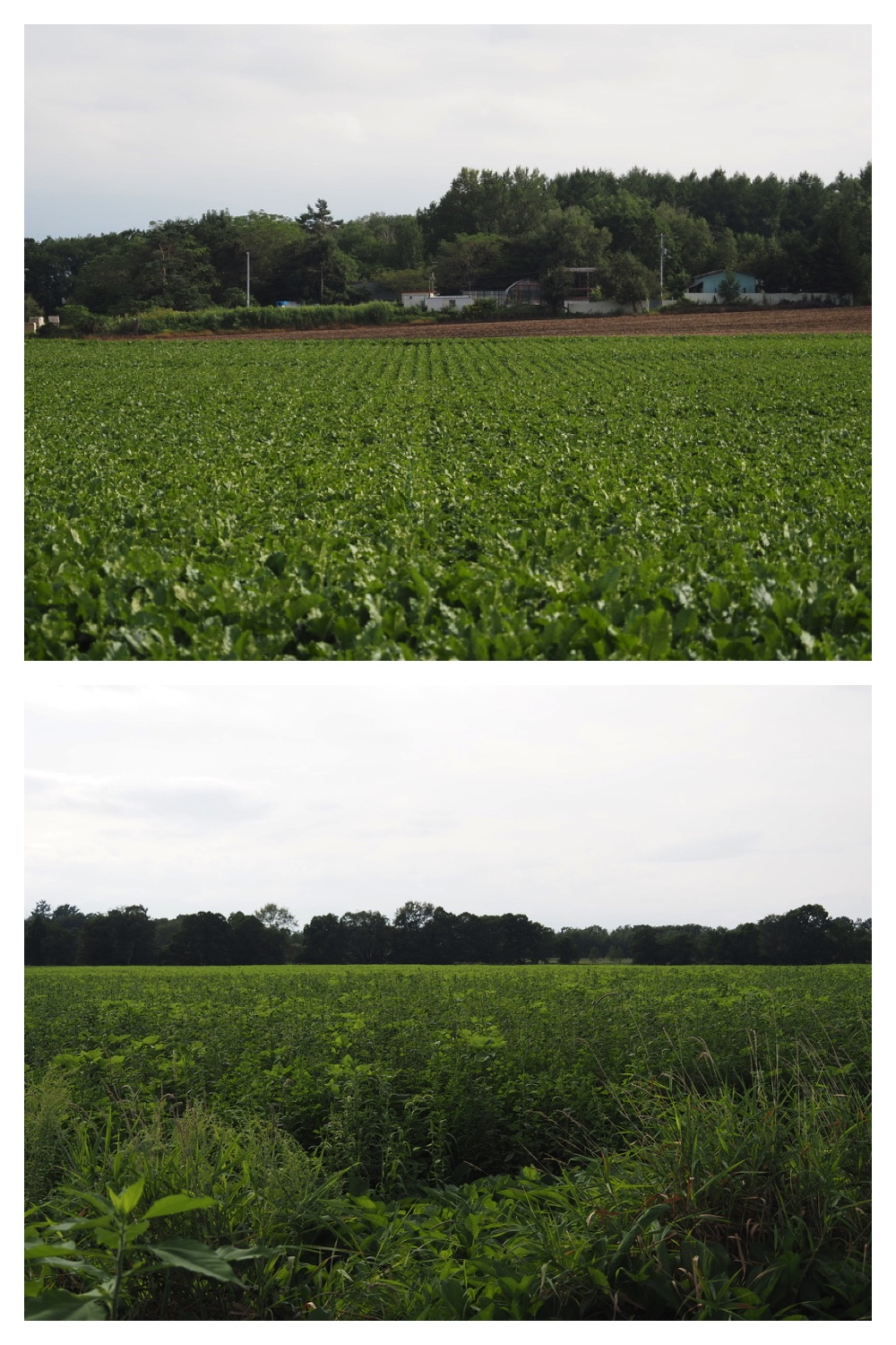 農家さんのビート畑(上)、雑草が茂る畜大の牧草地(下)