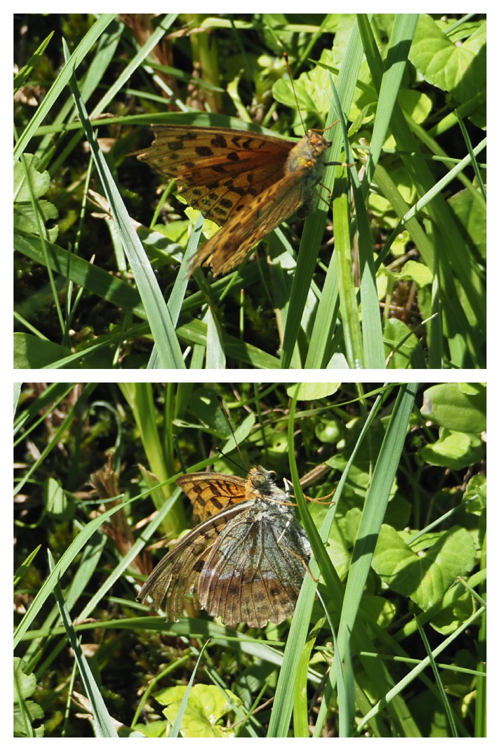 林床に留まったオオウラギンスジヒョウモン(上・下)