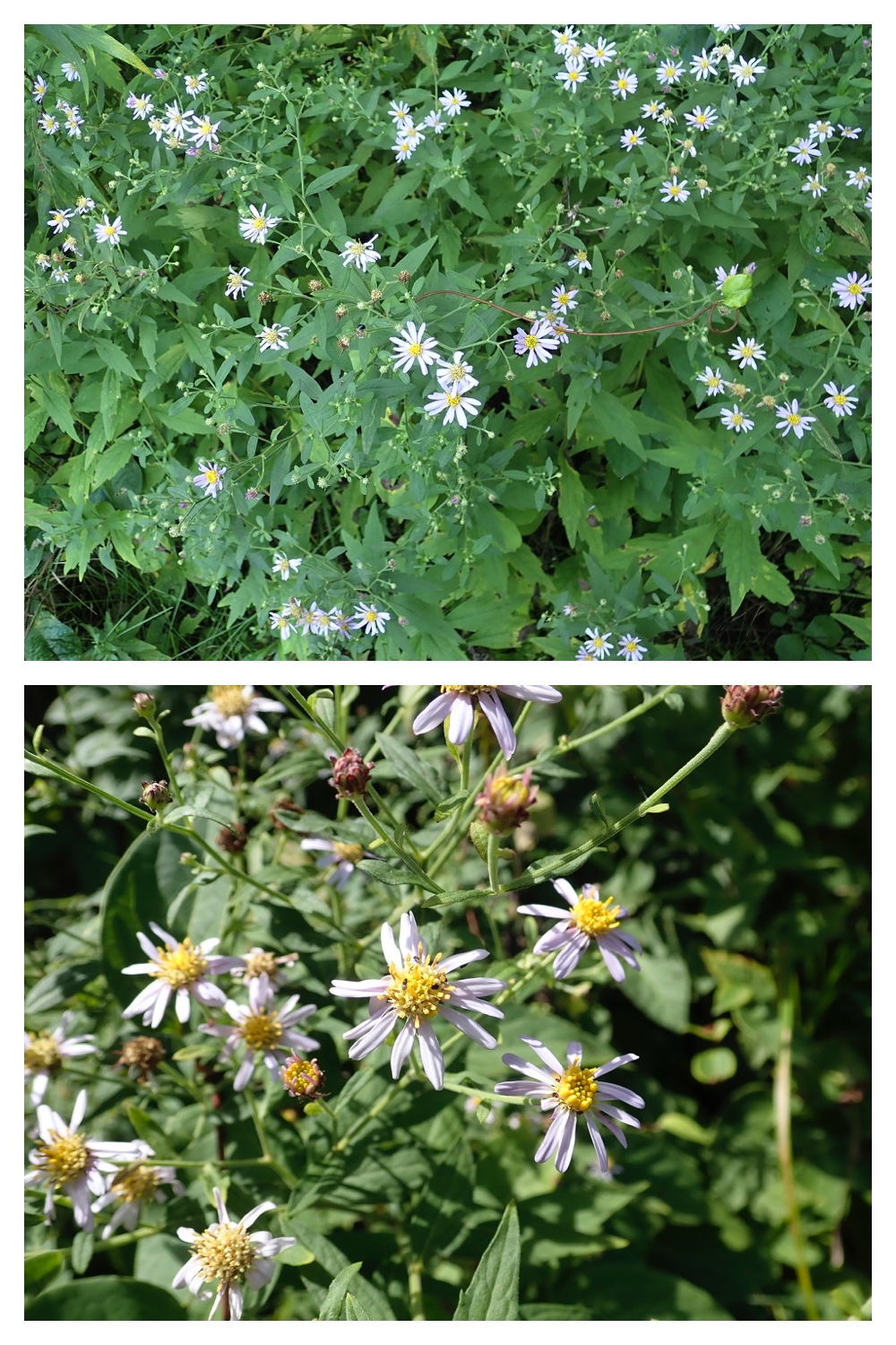 草刈りあとから生えてきた遅咲きのヤブハギ(上)、ヒメジョオン(下)