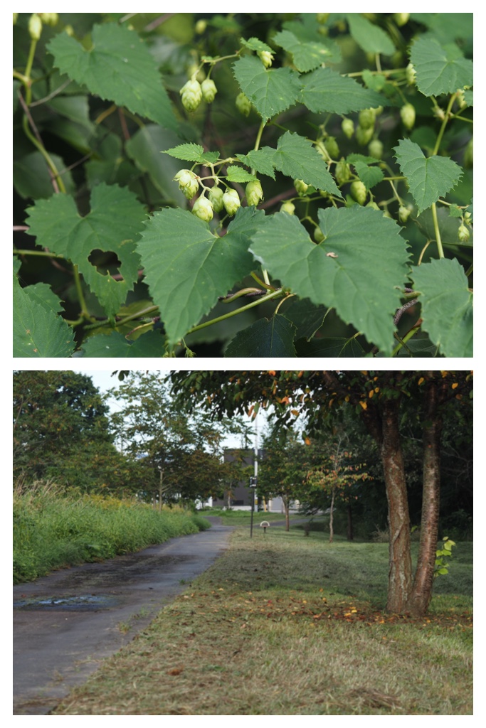 エゾトリカブト(上)、農業高校圃場のラップサイレージ(下)