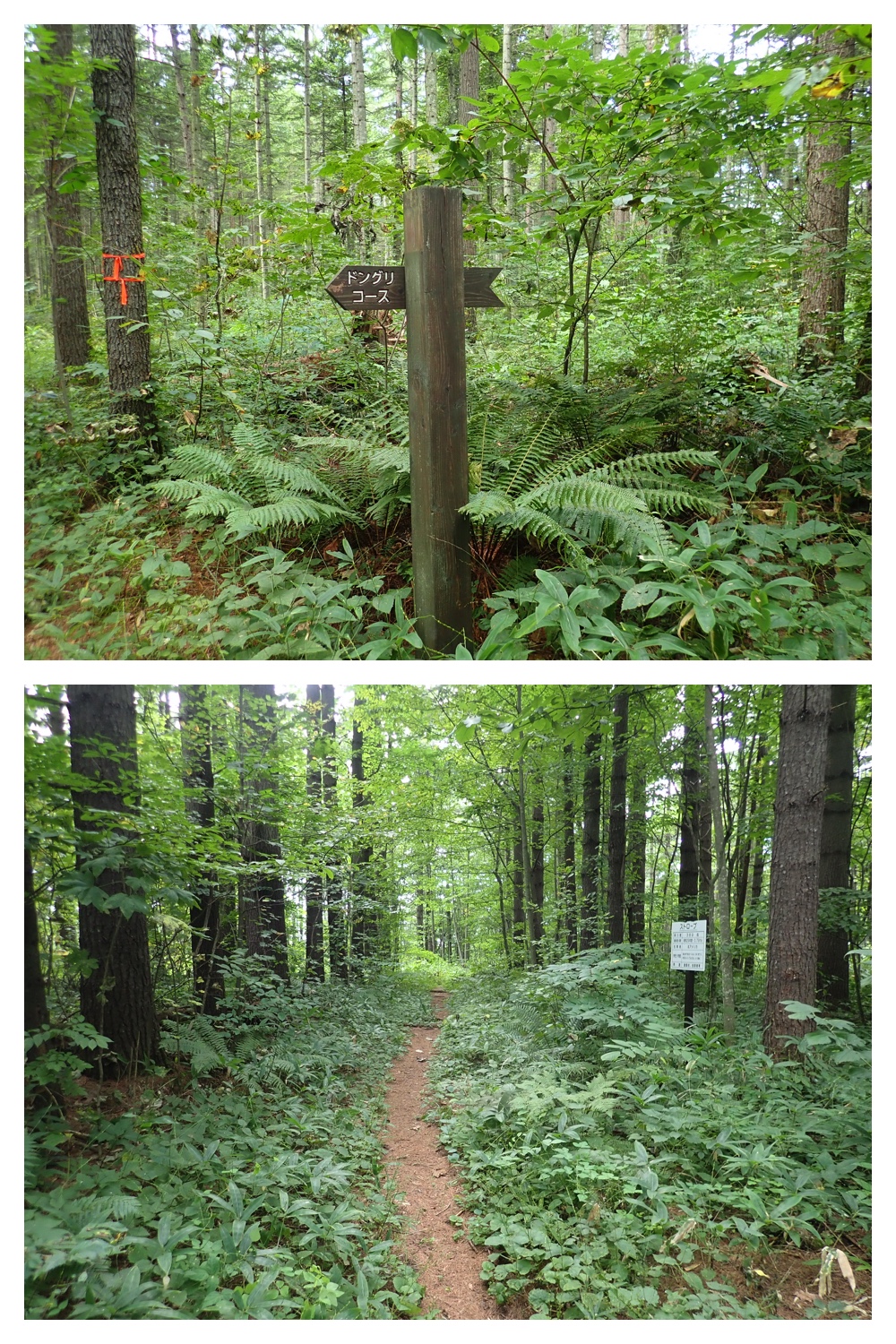 もりの山(上)、ドロノキの葉が積もった遊歩道(下)