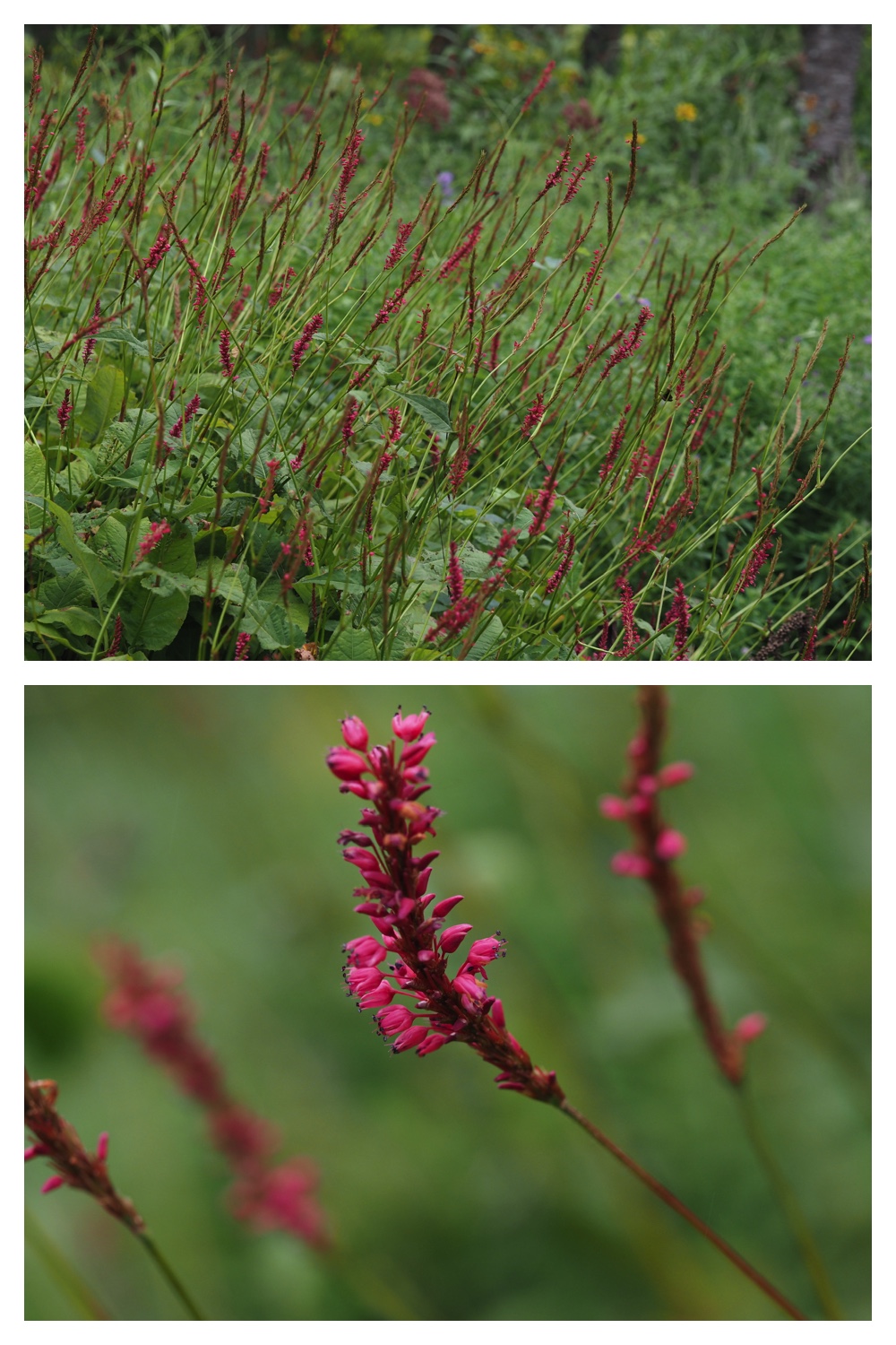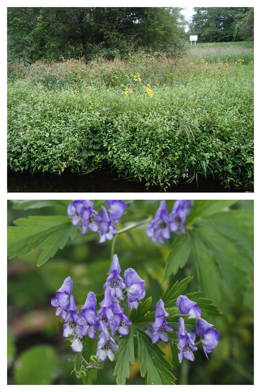 オオイタドリの群落(上)、赤い色のゲンノショウコの花(下)