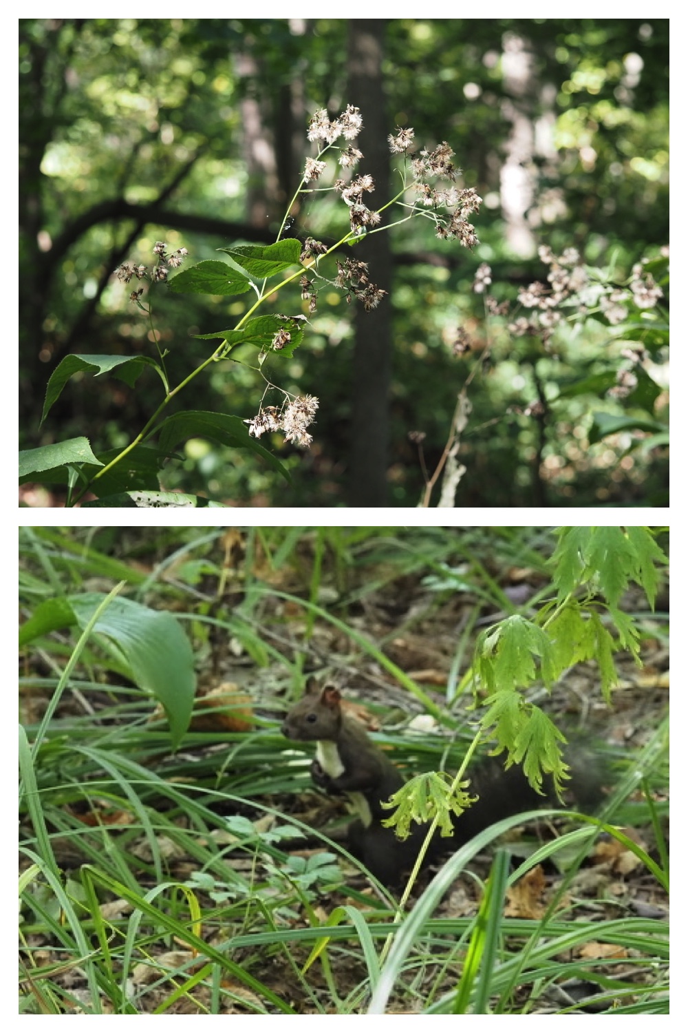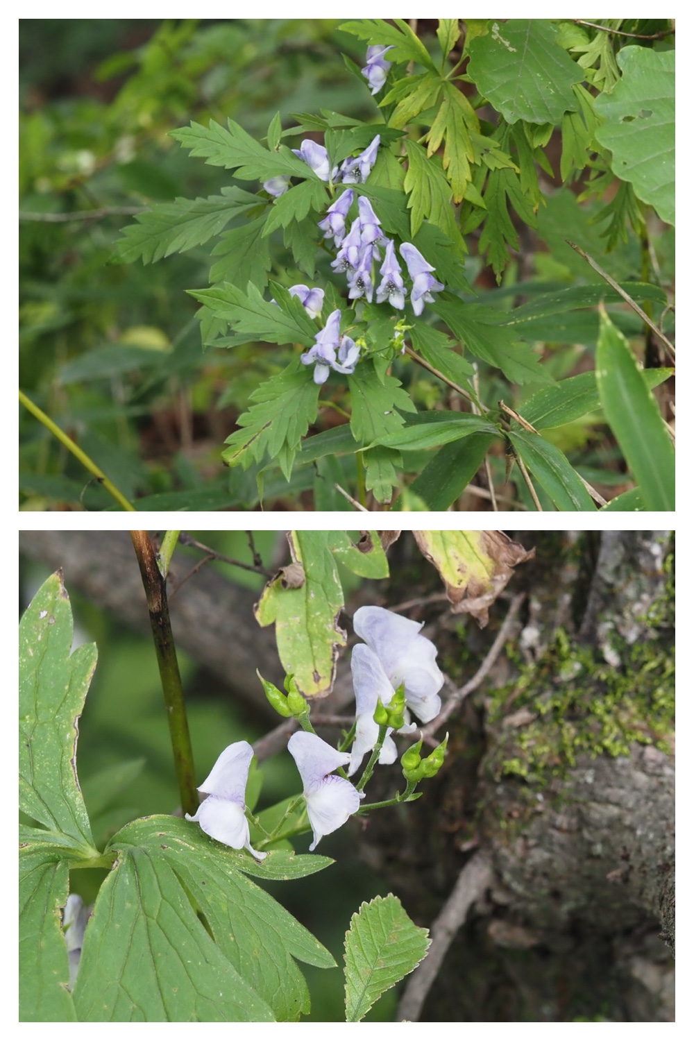 サラシナショウマの未熟な実(上)、エゾトリカブトの花と実(下)