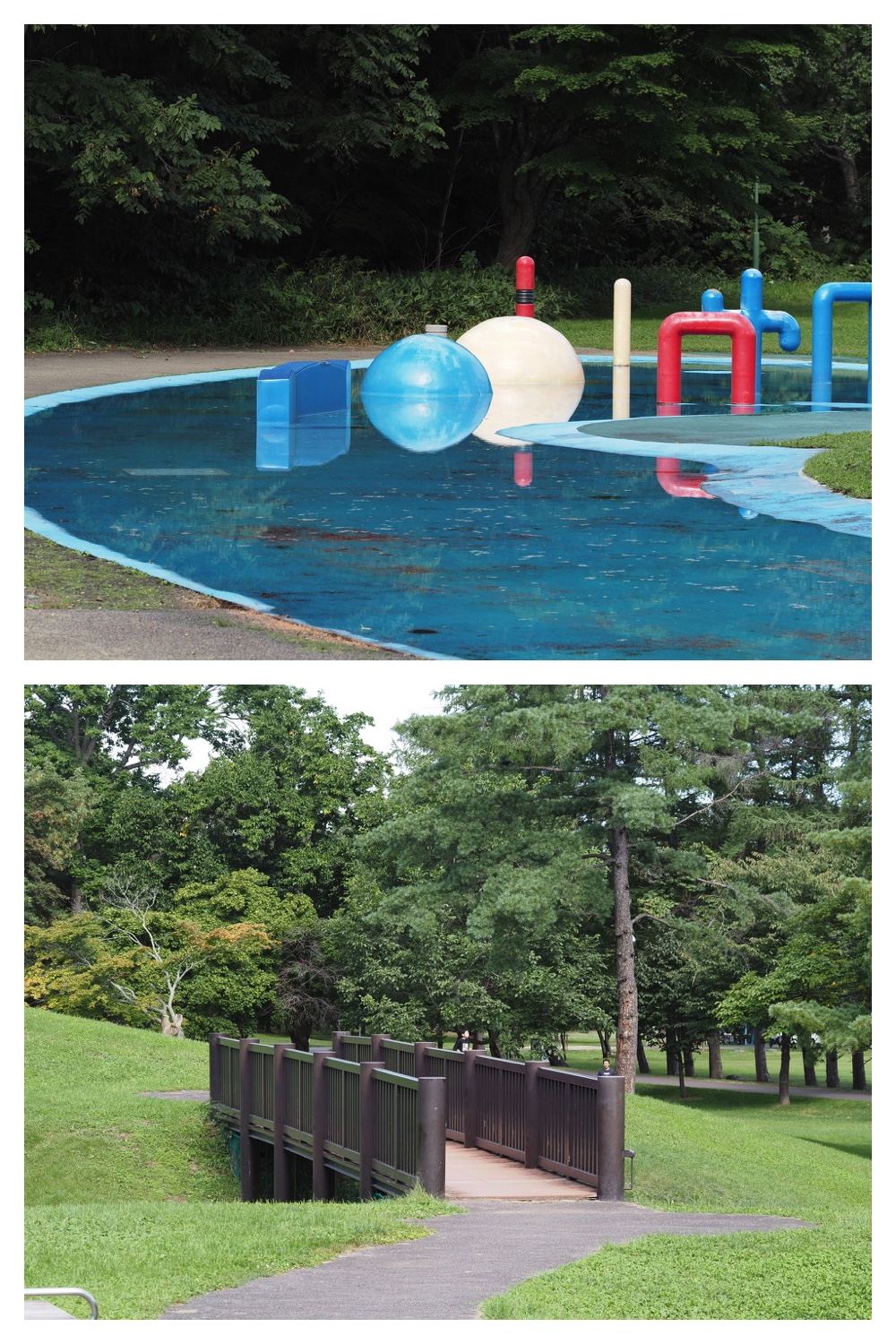 アマビエの足元に生えていたユキザサの実(上)、池のあずまや(下)