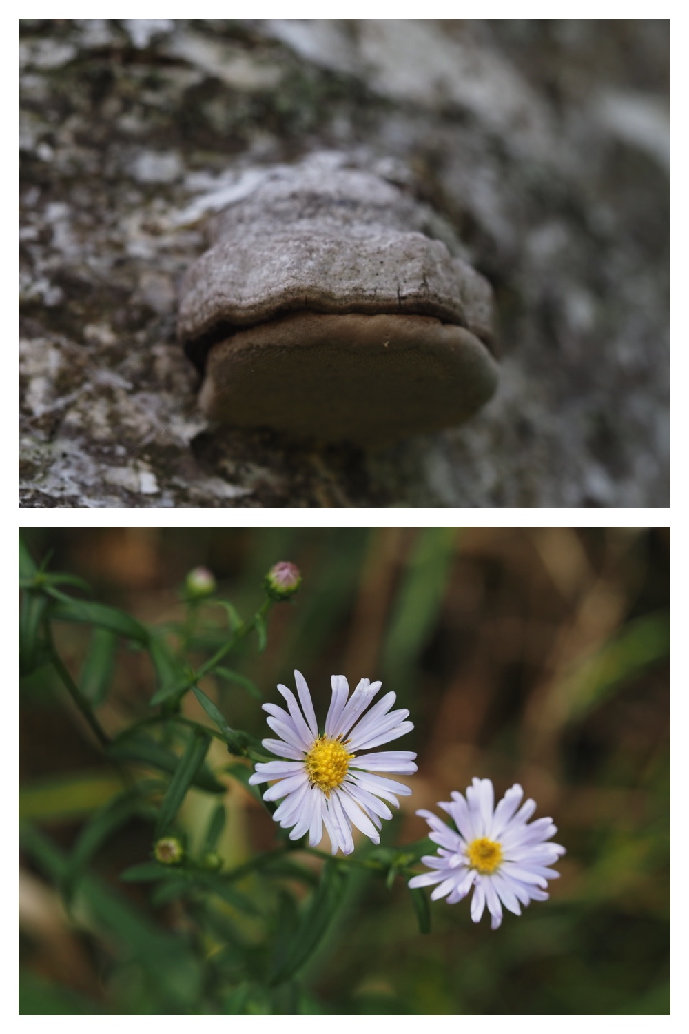 道沿いに生えていたキノコ(上)、ヨモギの蕾と花(下)