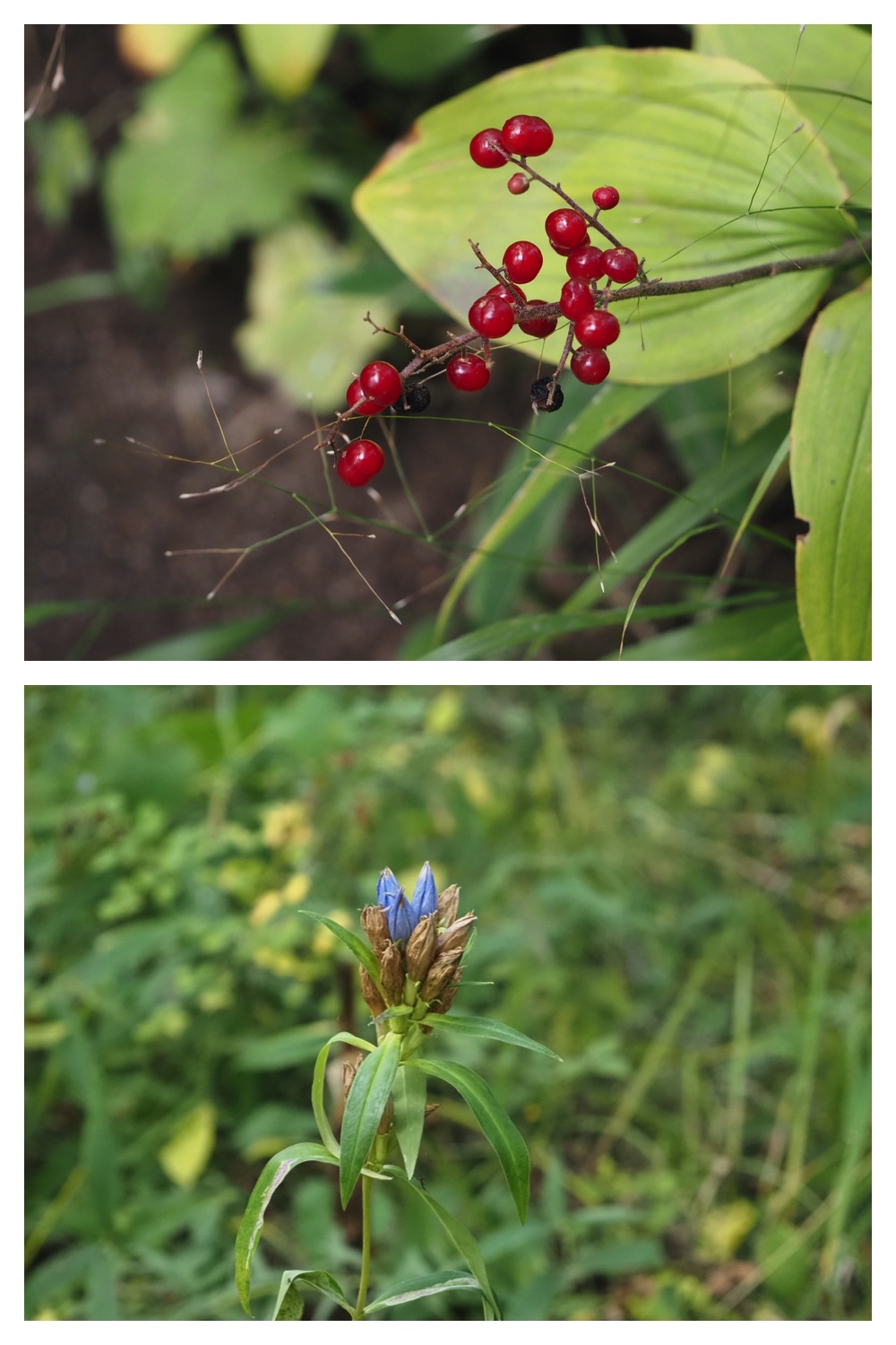 帯広市野草園にてユキザサの実(上)、エゾリンドウの花と実(下)