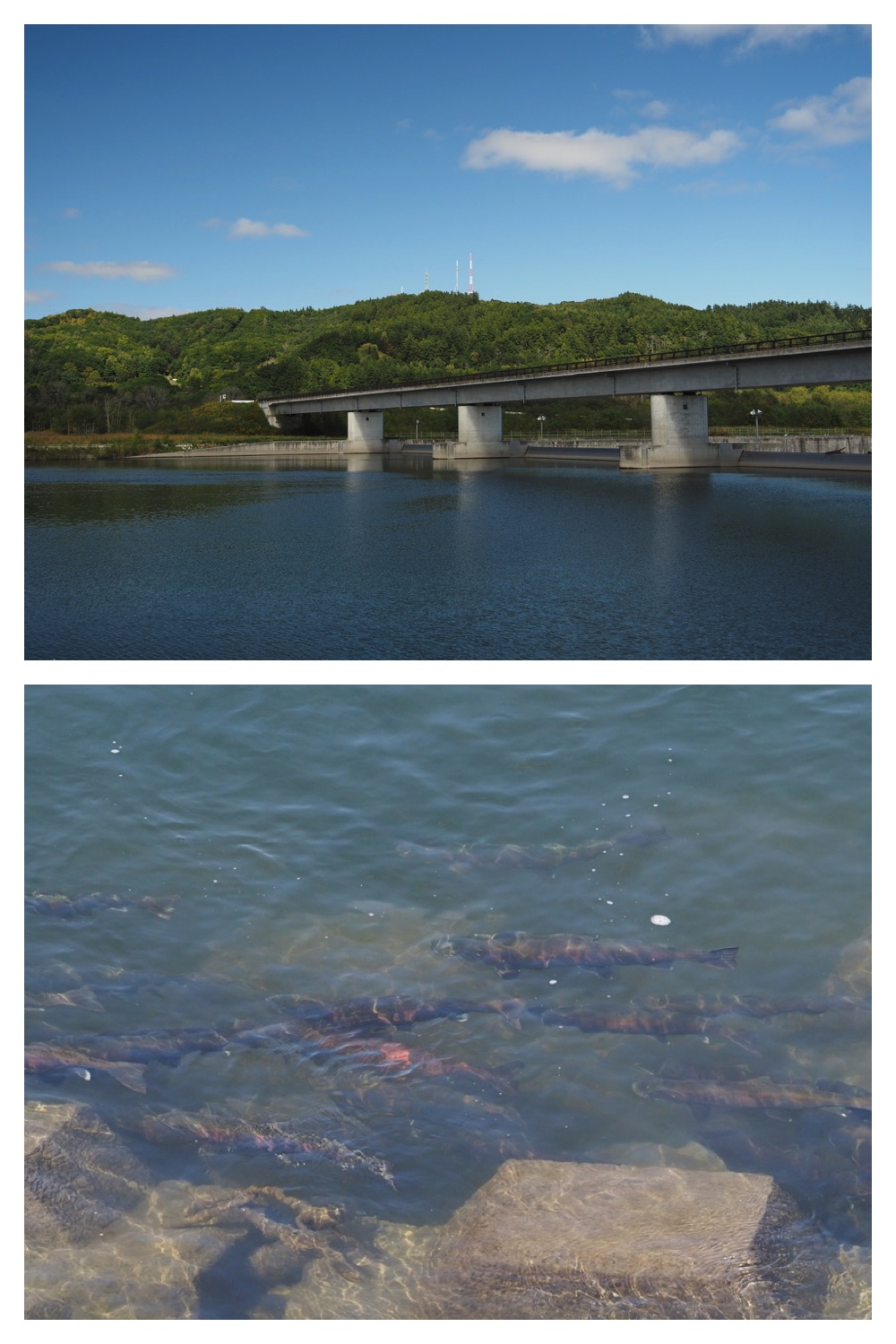 千代田分流堰(上)、堰の下にいたサクラマス(下)