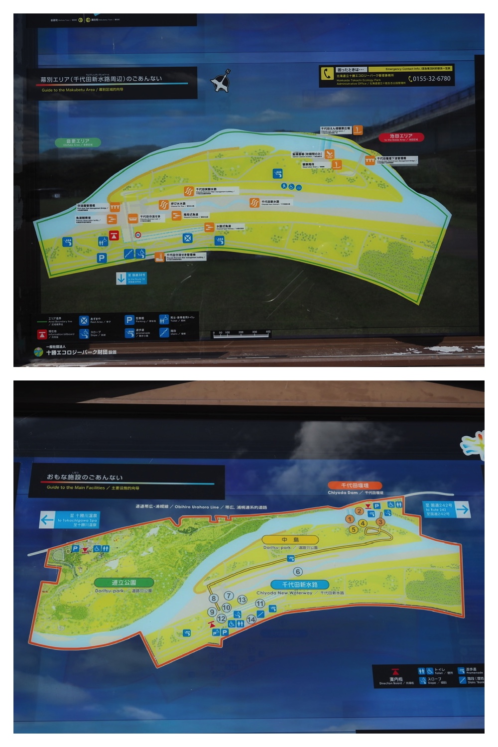 トトロードと中島の案内図(上)、トトロード、千代田堰堤、十勝エコロジーパークの案内図(下)